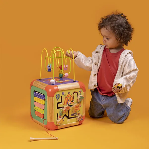 來自歐洲西班牙設計的馬戲團快樂遊戲盒 具有五個不同的遊戲面 包括串串珠,畫黑板,彩色木琴,馬達電路,盒部還有珠狀迷宮 幫助孩子發展手眼的協調 鮮豔的色彩和圖案有助於視覺刺激 不同的紋理和質感,有助於成長期的小朋友進行觸覺探索