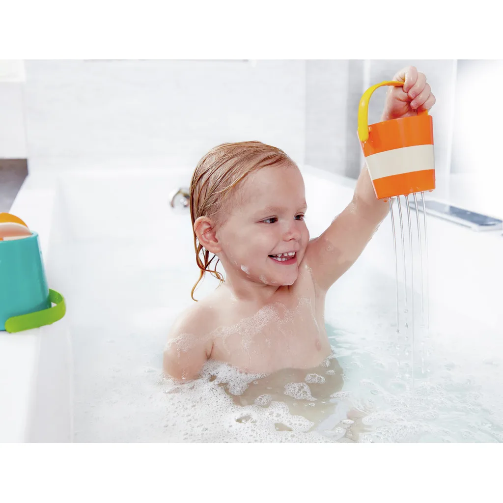 三個色彩鮮豔、具有排水功能的桶,提供有趣的互動 非常適合小朋友在玩洗澡時玩樂工具!